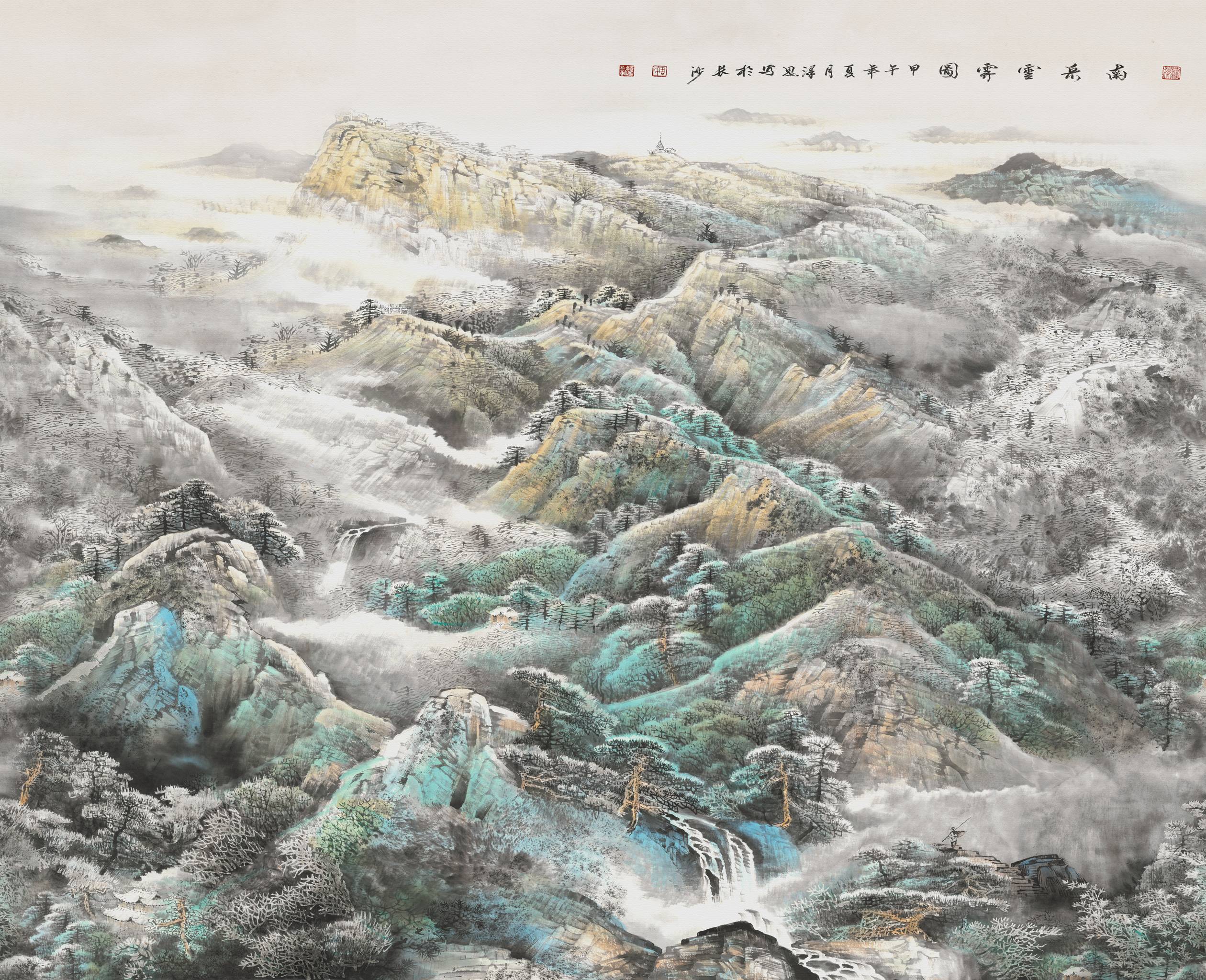 《南岳云雾图》是位于湖南省南岳衡山的奇妙景色,充分描绘了远近高低各不相同的山峰奇观,展现了作者超高的风景写实的绘画技巧。