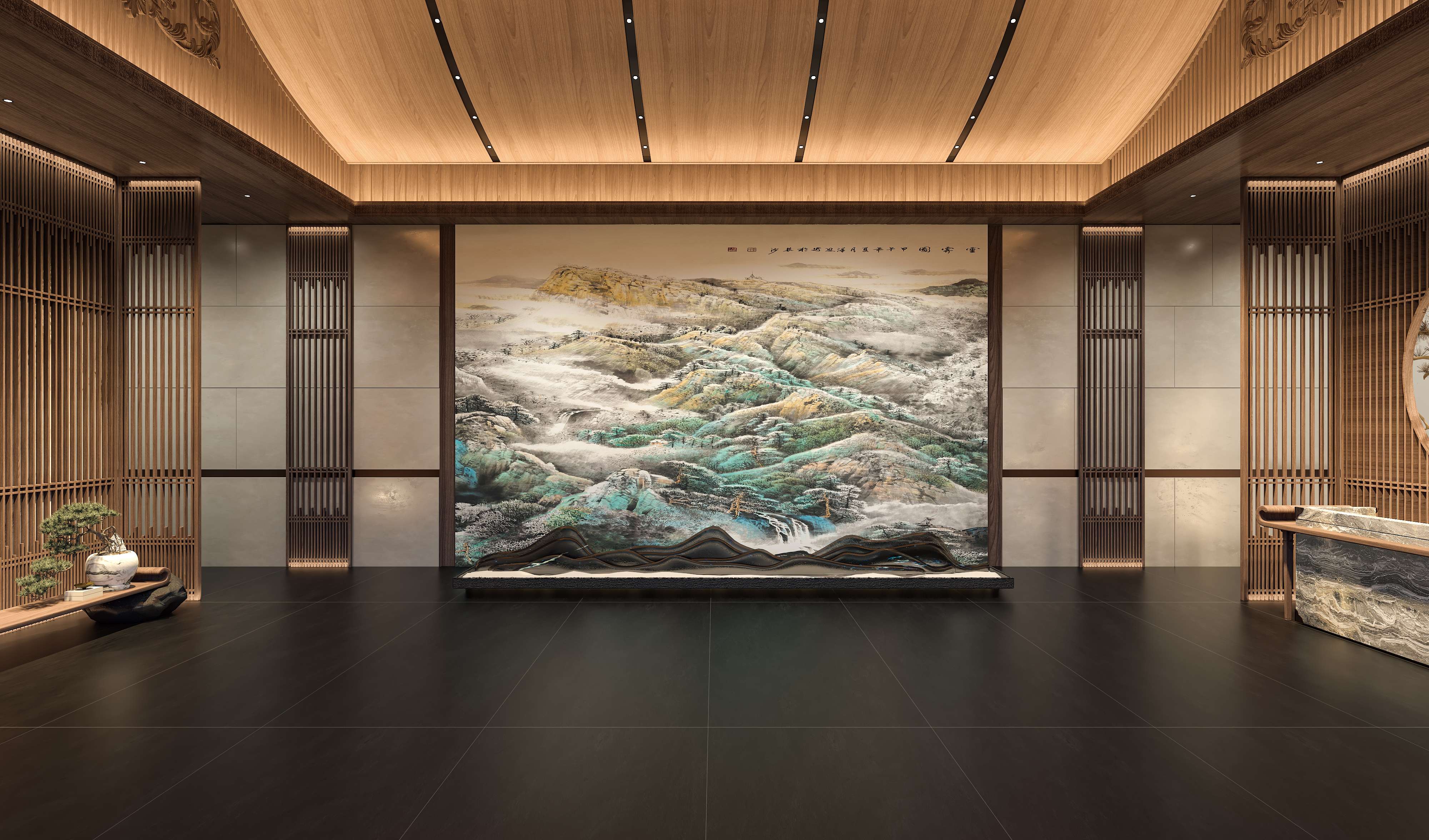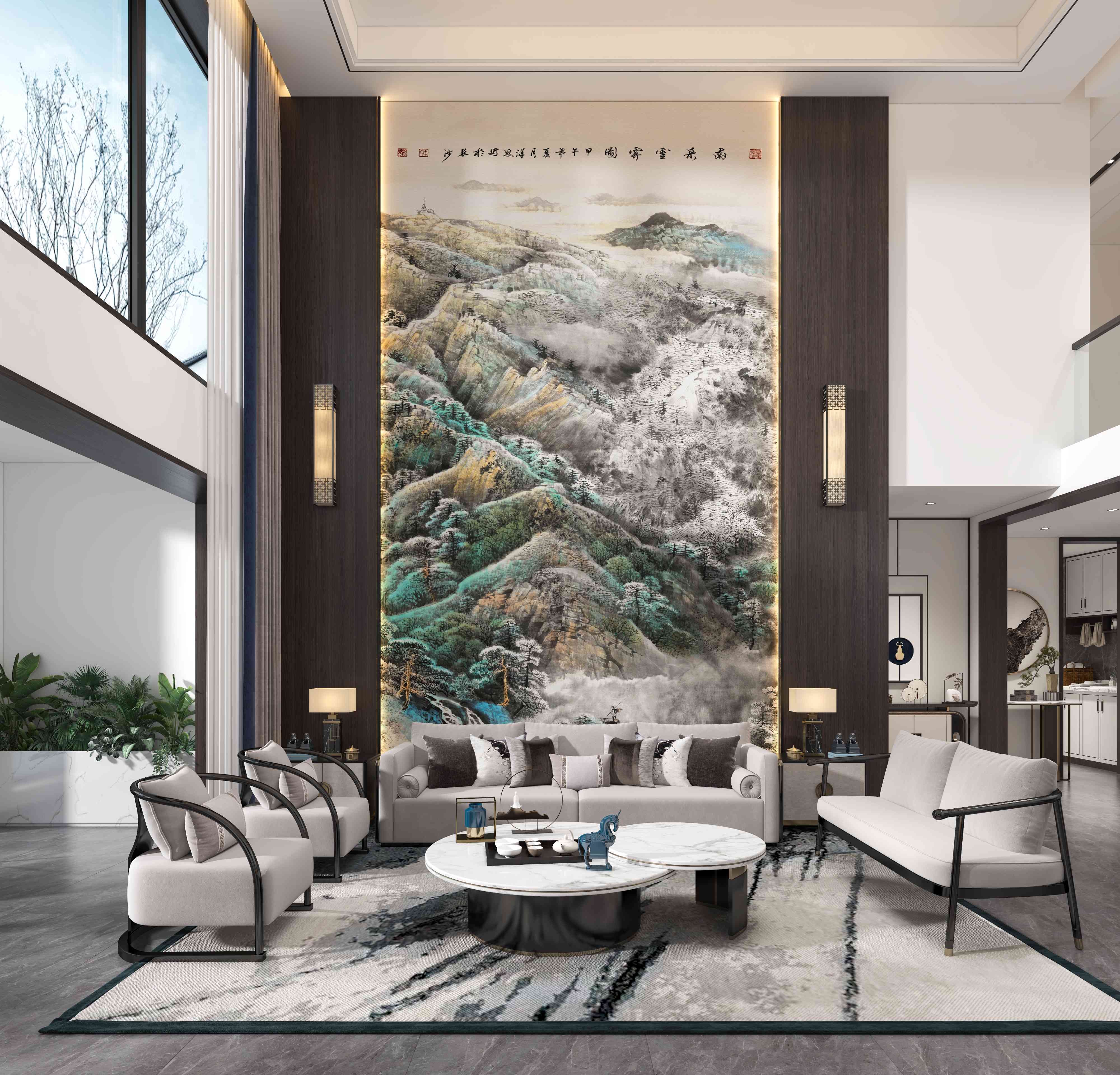 ·朦胧的远山,笼罩着一层轻纱,在缥缈的云烟中忽近忽远,若即若离,寓意气运亨通。山间溪水涛涛,奔流不息,寓意流水生财,松树郁郁葱葱,高大挺拔,寓意万古常青。